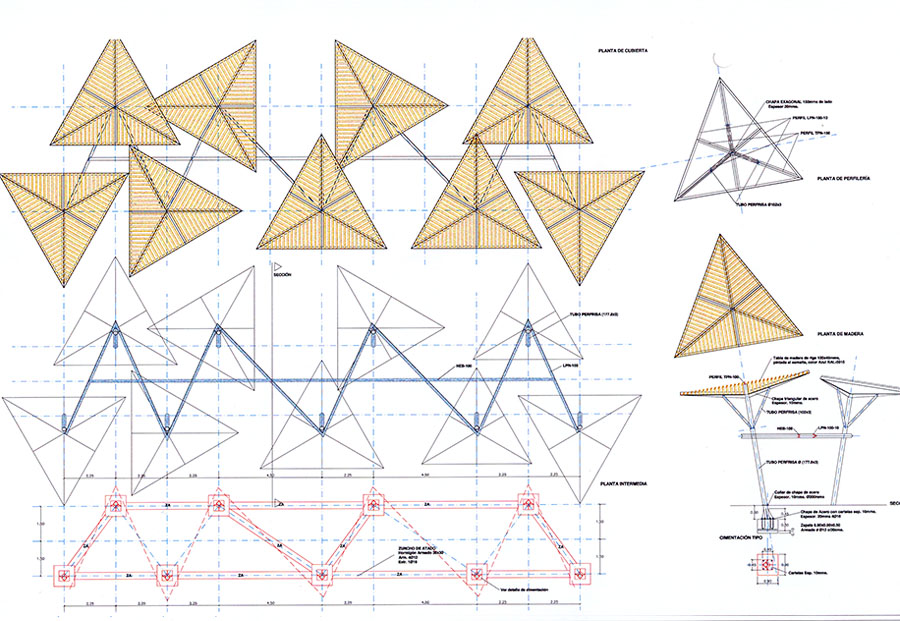 La construcción de determinados muros en hormigón visto va definiendo una separación neta entre las superficies de acceso peatonal y las áreas ajardinadas al tiempo que contribuyen a potenciar las visuales lejanas hacia el pico Teide y el interior del parque. Una pérgola formada por paraguas triangulares de madera otorga una sombra provisional hasta que la masa arbolada adquiera el porte necesario